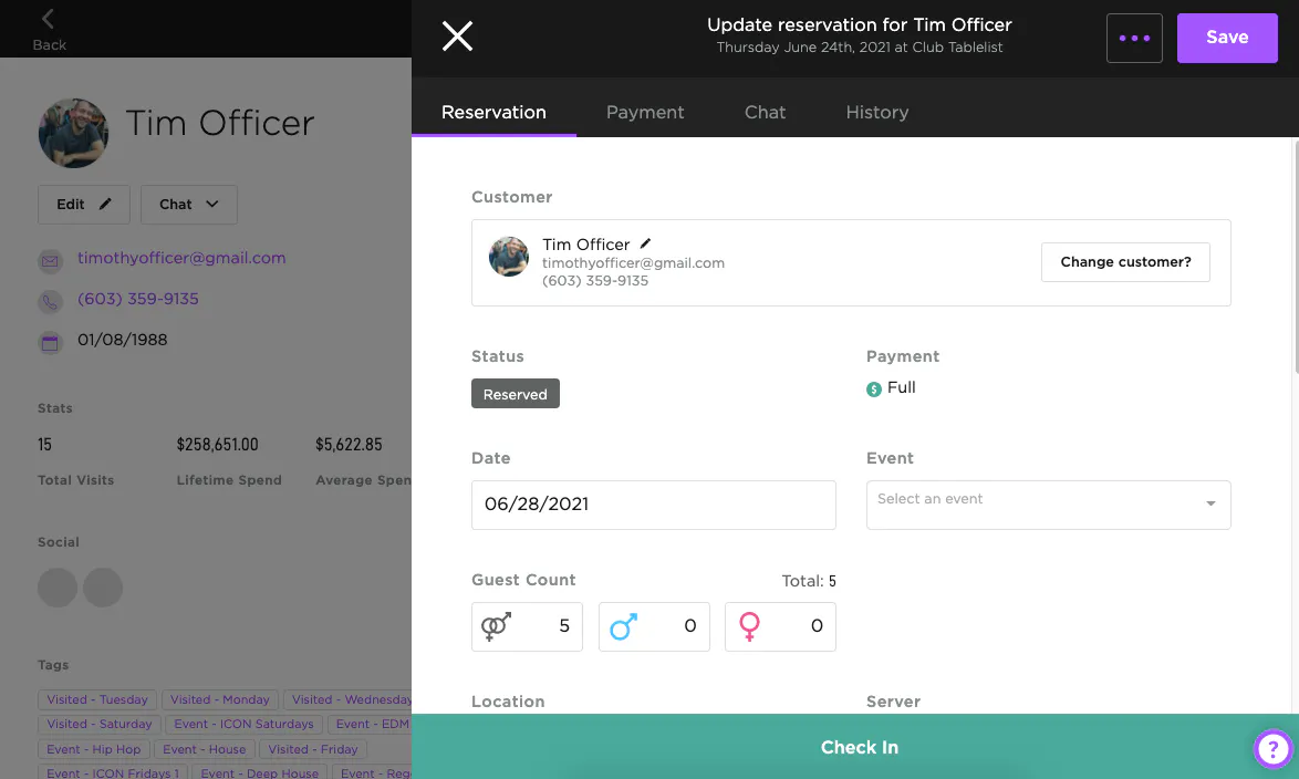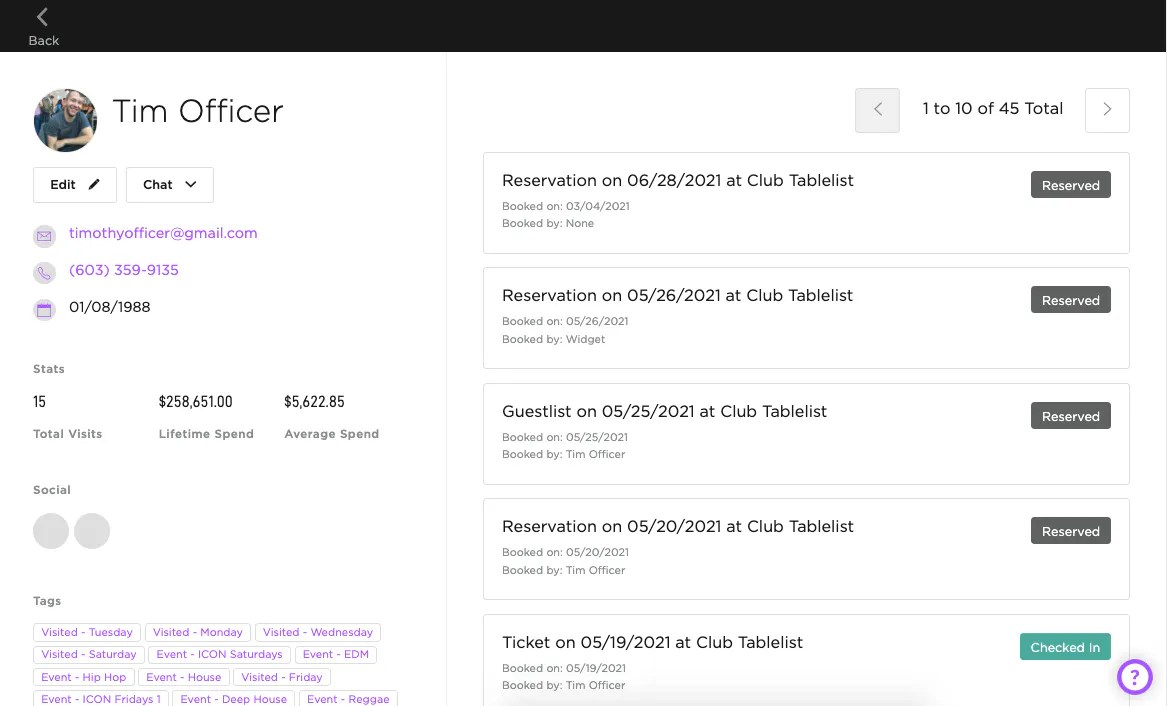 Click a customer's name to view their full profile -- Stats, Birthday, Social Media, Tags, Marketing Opt-Ins, and a complete reservation history.