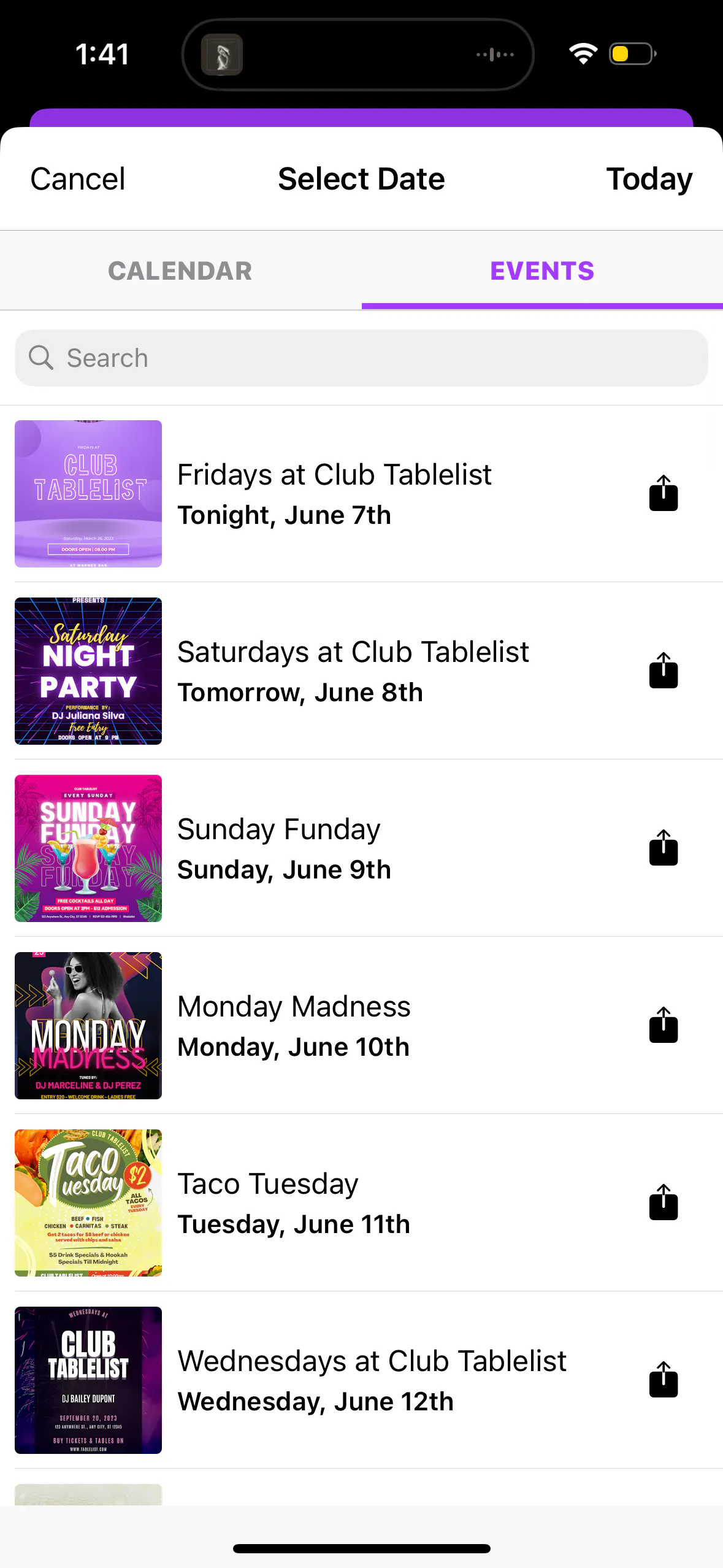 On the TablelistPro mobile app, tap the date at the top, then tap Events.