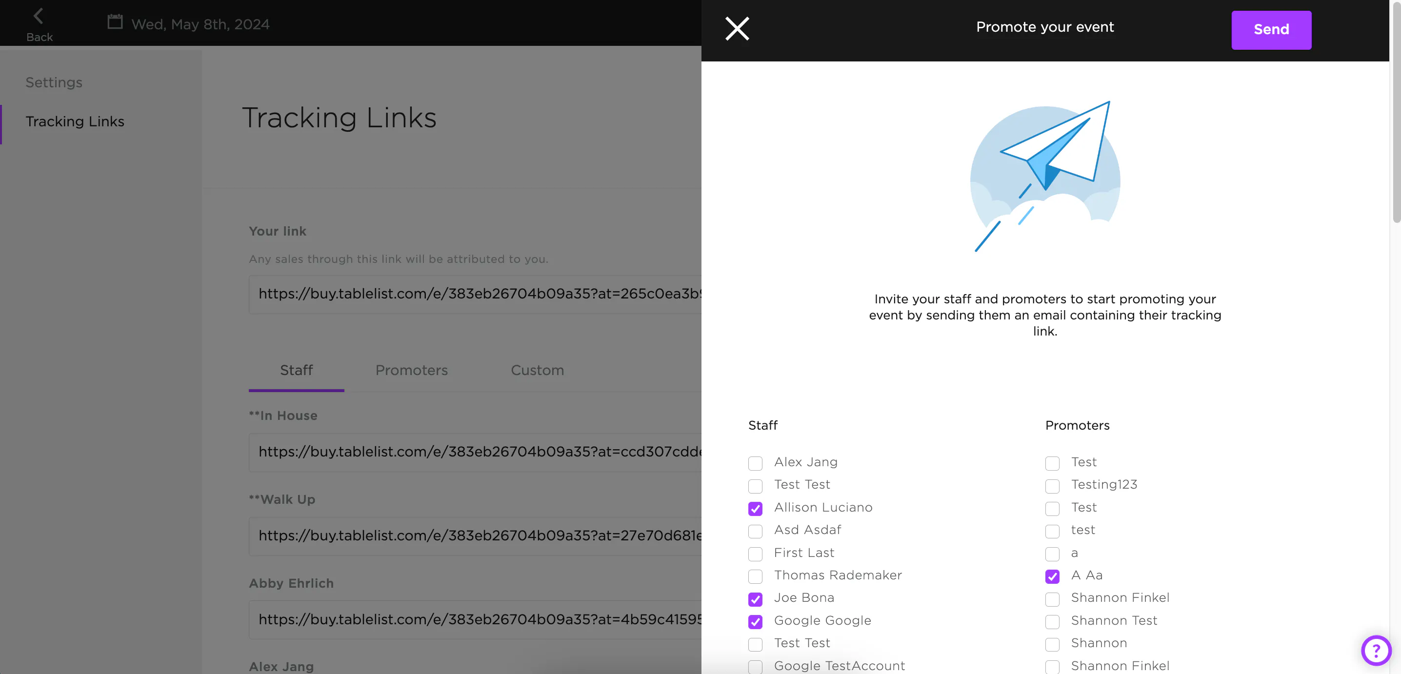 Check off the staff members or promoters you want to send to, add a message under Notes (optional), and press Send.
