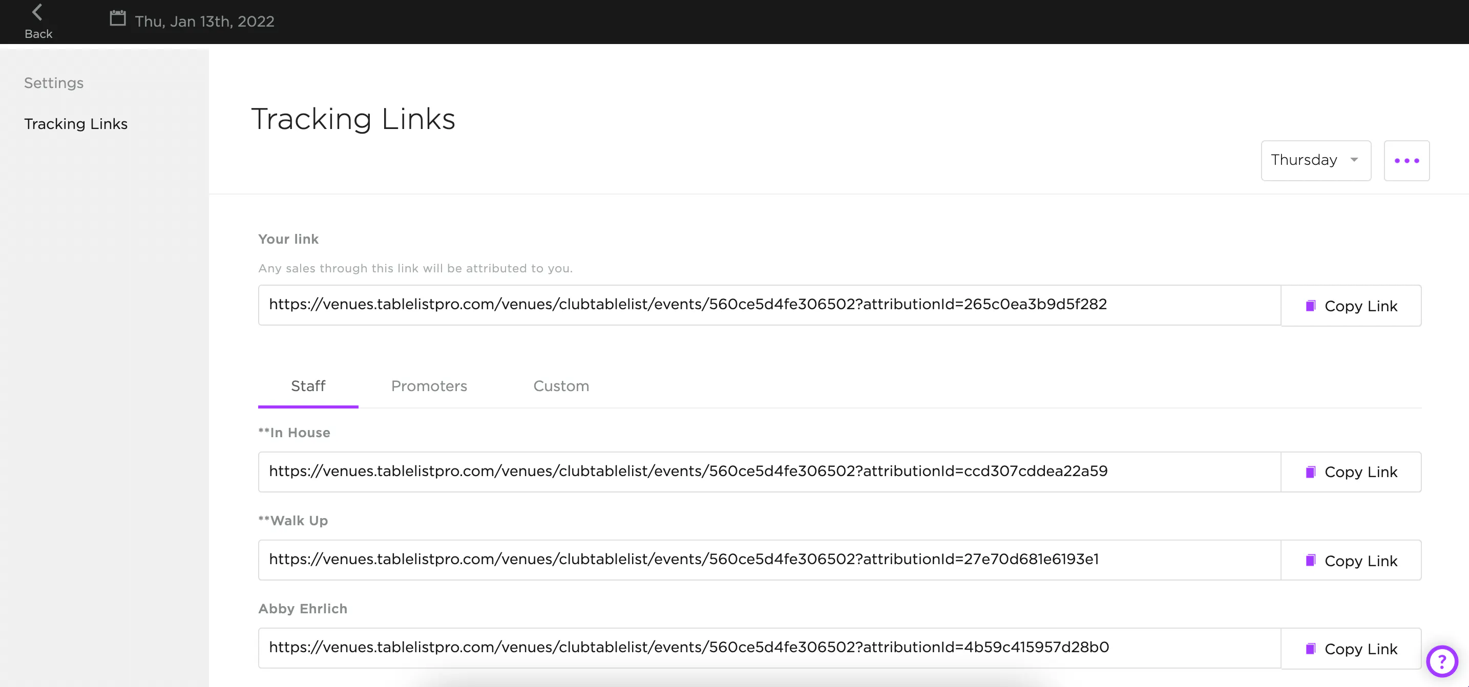You'll see your own event tracking link, plus links for your Staff, Promoters, and Custom Attributions.