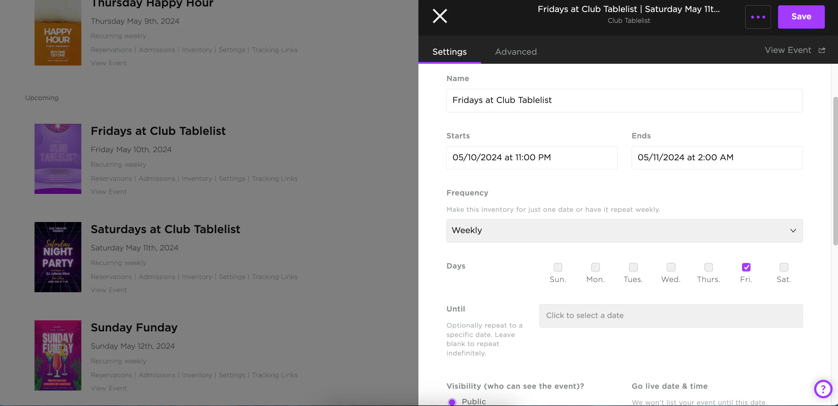 When creating an event, set the Frequency to Weekly and check the days you want it to repeat. For example, to run every Friday, create the event on a Friday, select Weekly, and check Friday. The event will automatically list every Friday going forward.