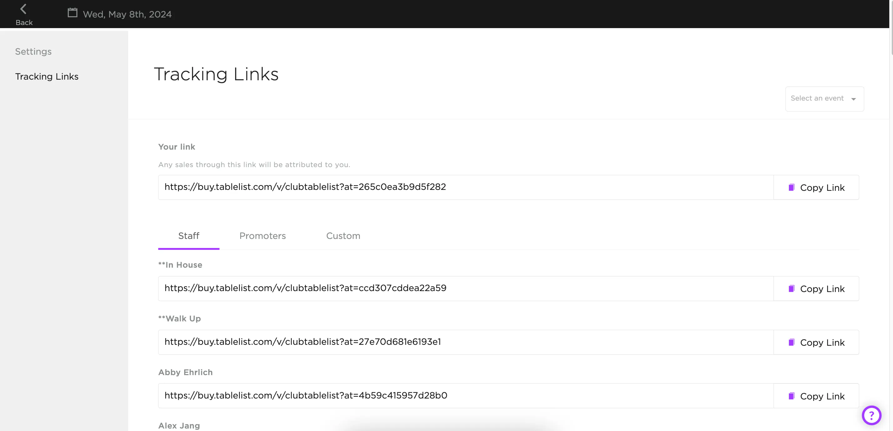 You'll see your own venue tracking link, plus links for your Staff, Promoters, and Custom Attributions.