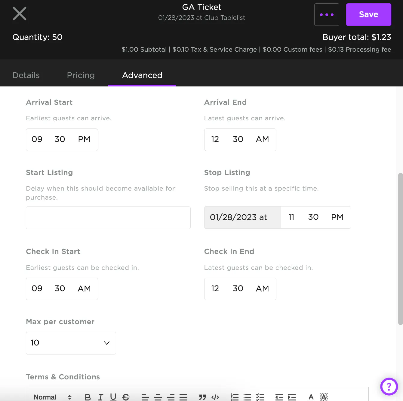 On the Advanced tab, fill in each field and set the Check-In Start and Check-In End times.