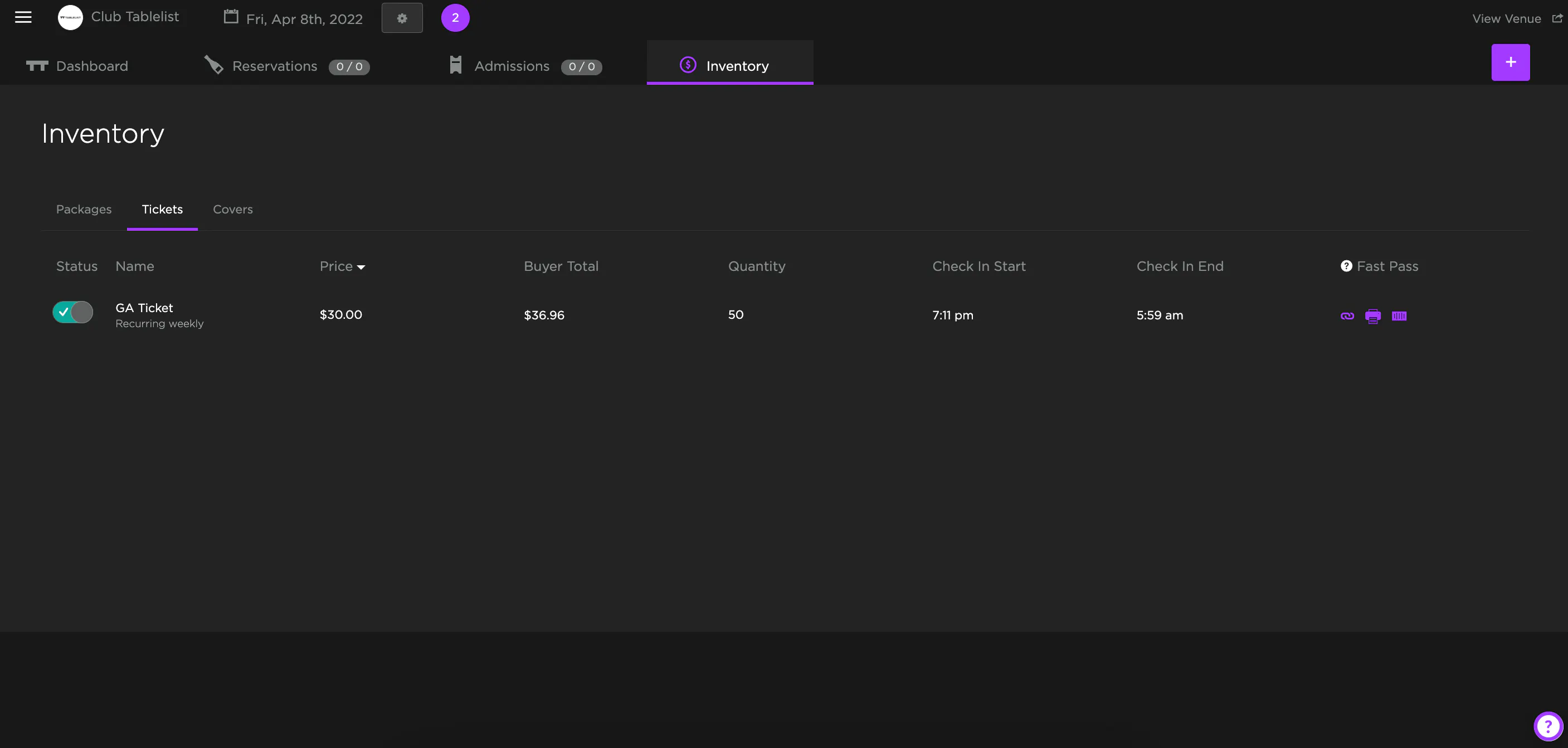 To start selling tickets and covers (guest lists), open the sidebar, click Manage, then click Inventory.
