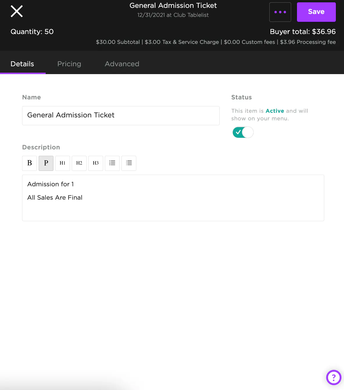 Under Details, fill in the inventory name (e.g., GA Ticket) and description.