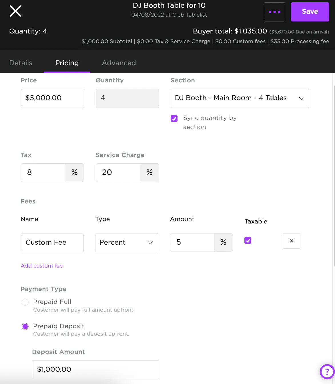 On the Pricing tab, fill in price, quantity, tax %, service charge %, fees, payment type, and processing fee.