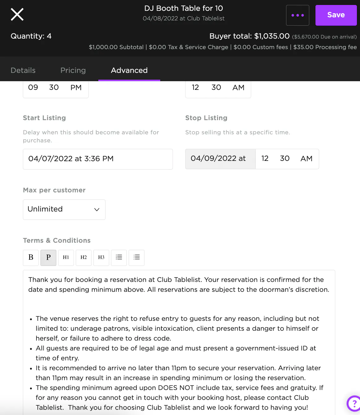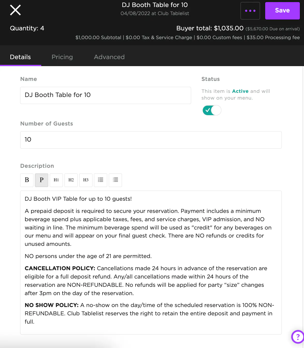 For the Description, include everything the customer needs to know: beverage minimums, taxes and fees, cancellation policy, no-show policy, and age limits.