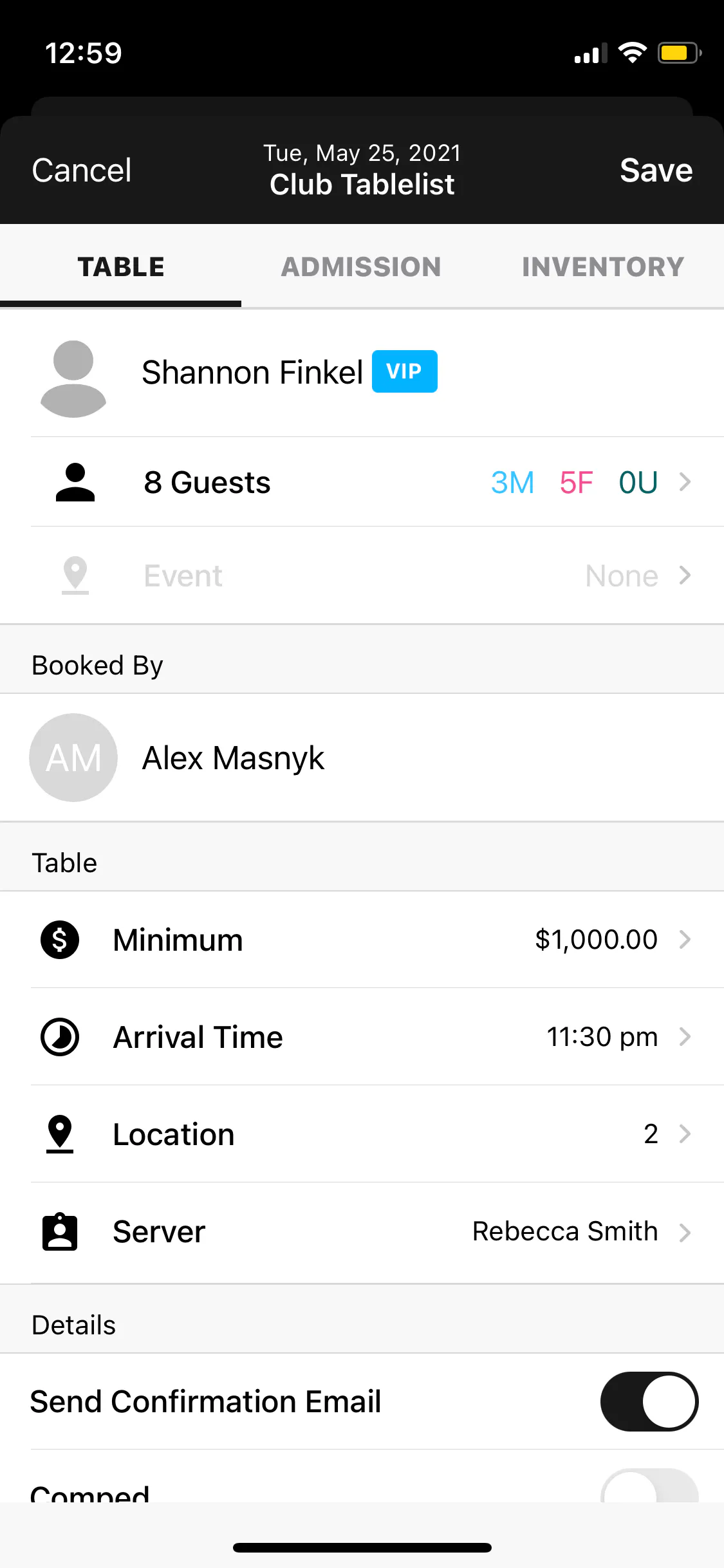 Under Table, tap the plus sign next to Add Customer to add the customer's name. If they've been to your venue before, their info will auto-populate when you select their profile.