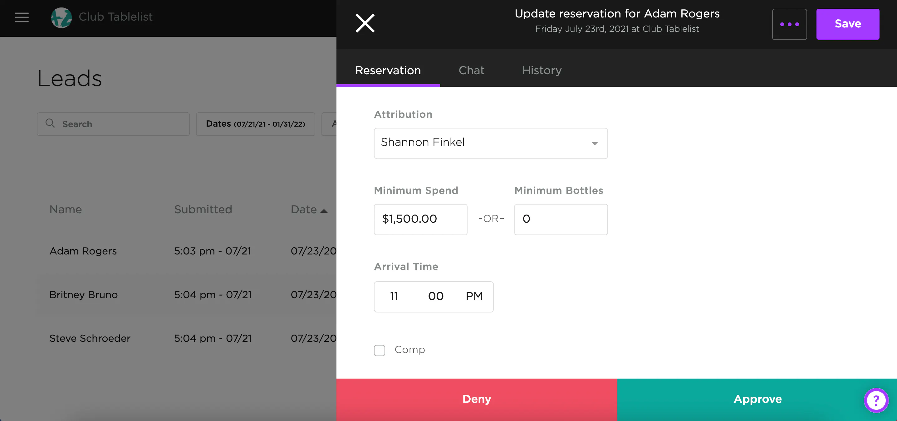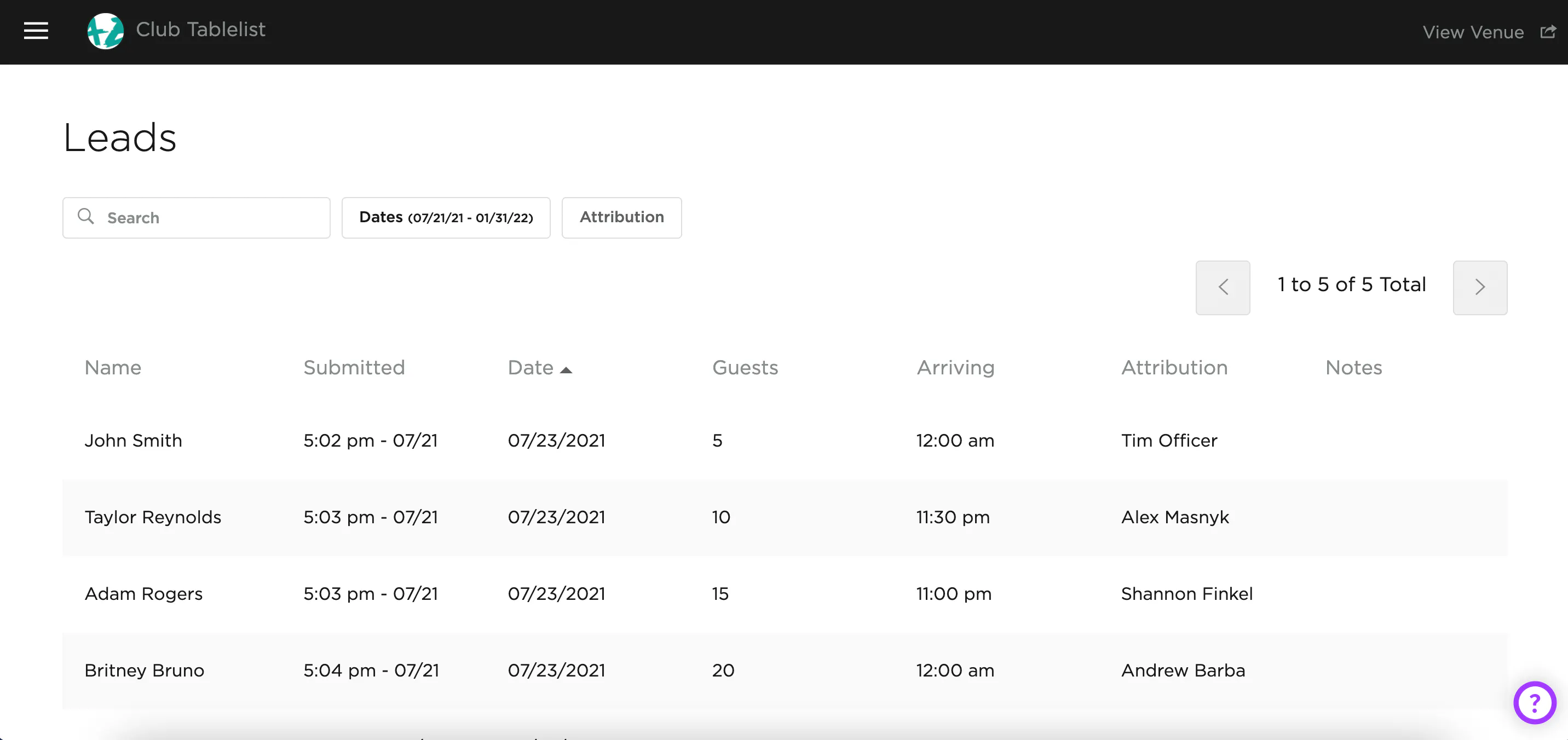 - Sort leads by name, date submitted, event date, number of guests, arrival time, attribution, and notes