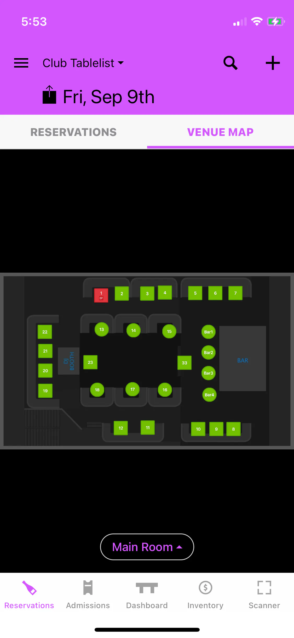 Once assigned, the table turns red on the Venue Map. Green = available, gray = checked in.