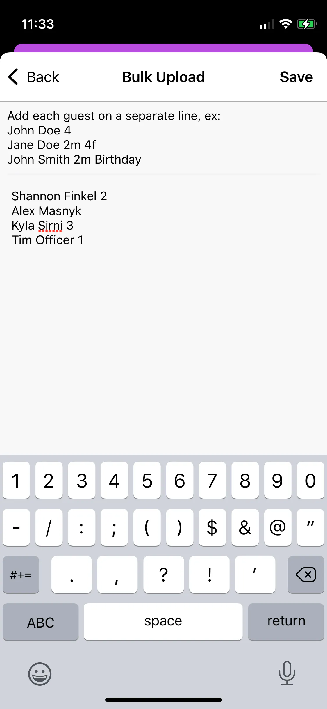 To bulk-add guests on the TablelistPro mobile app, tap the Admissions tab, press Add Guest List, tap Bulk Add Guests, paste your list in the proper format, and press Save.