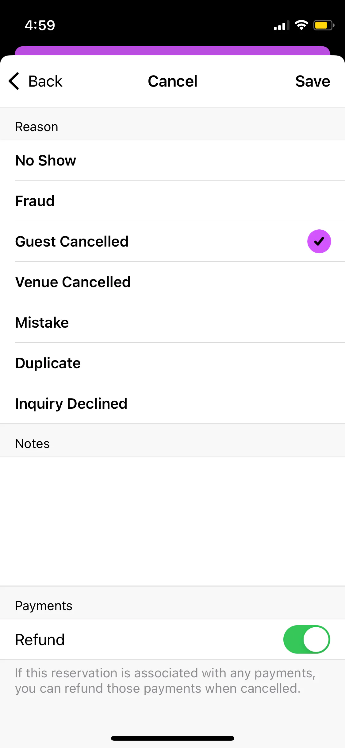 On the next screen, provide a cancellation Reason, fill in optional Notes, decide whether to Refund the customer by toggling the button, then press Save.