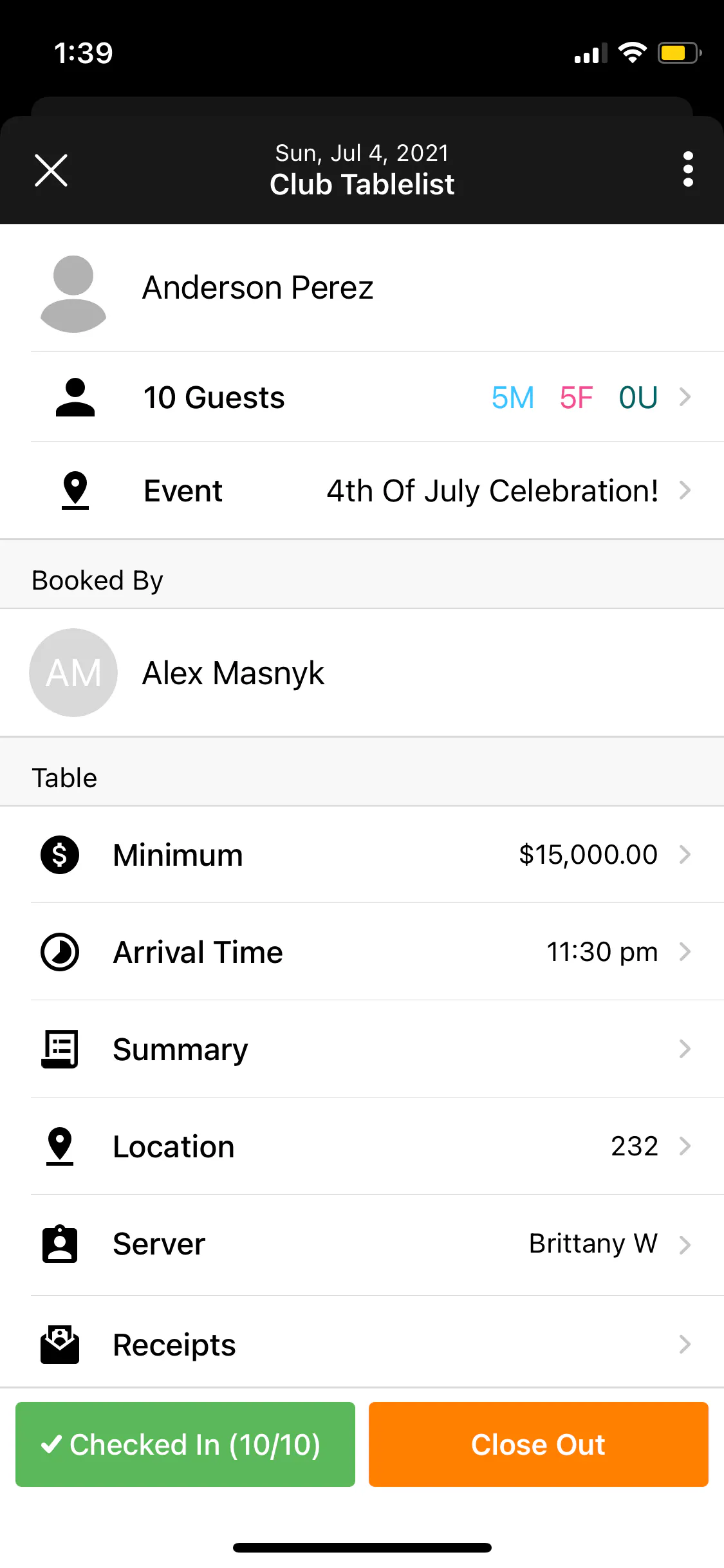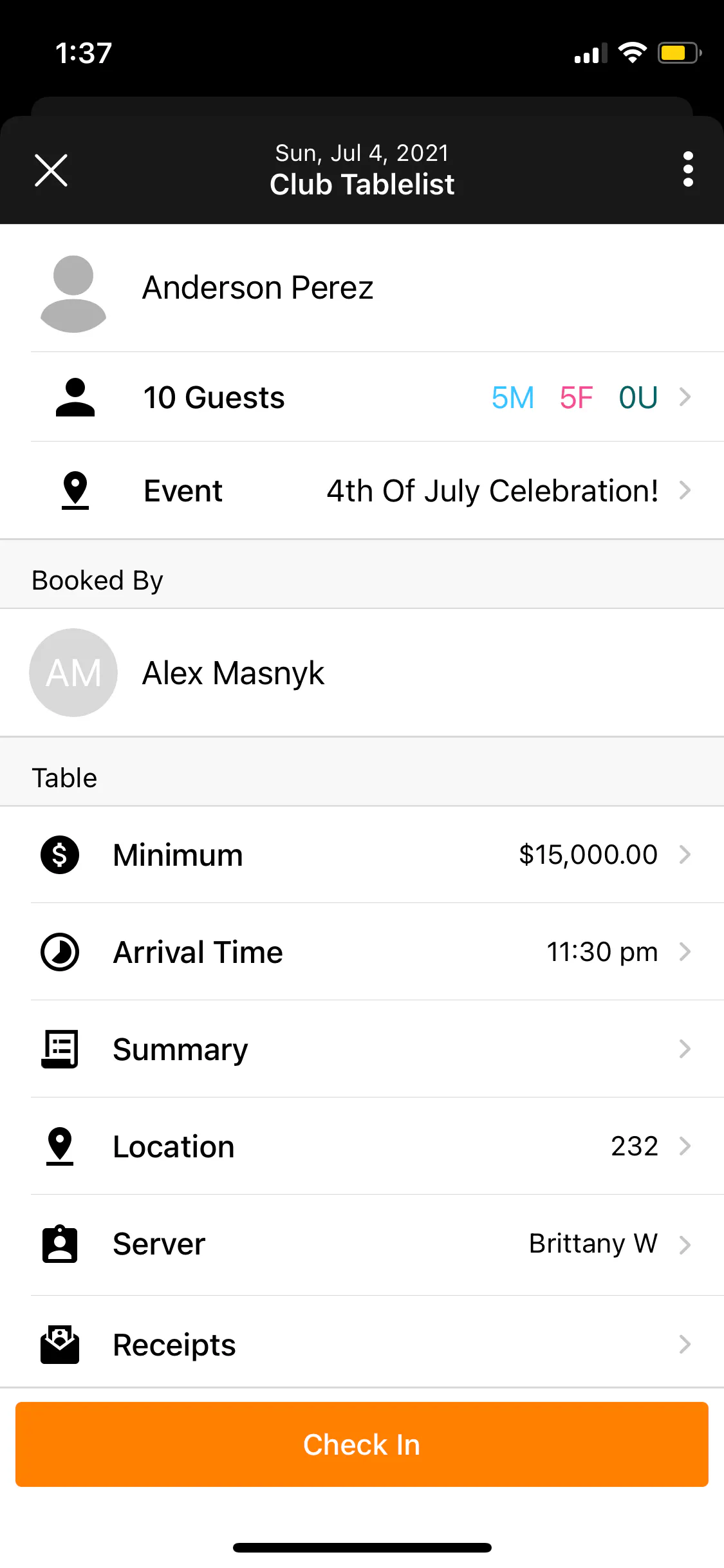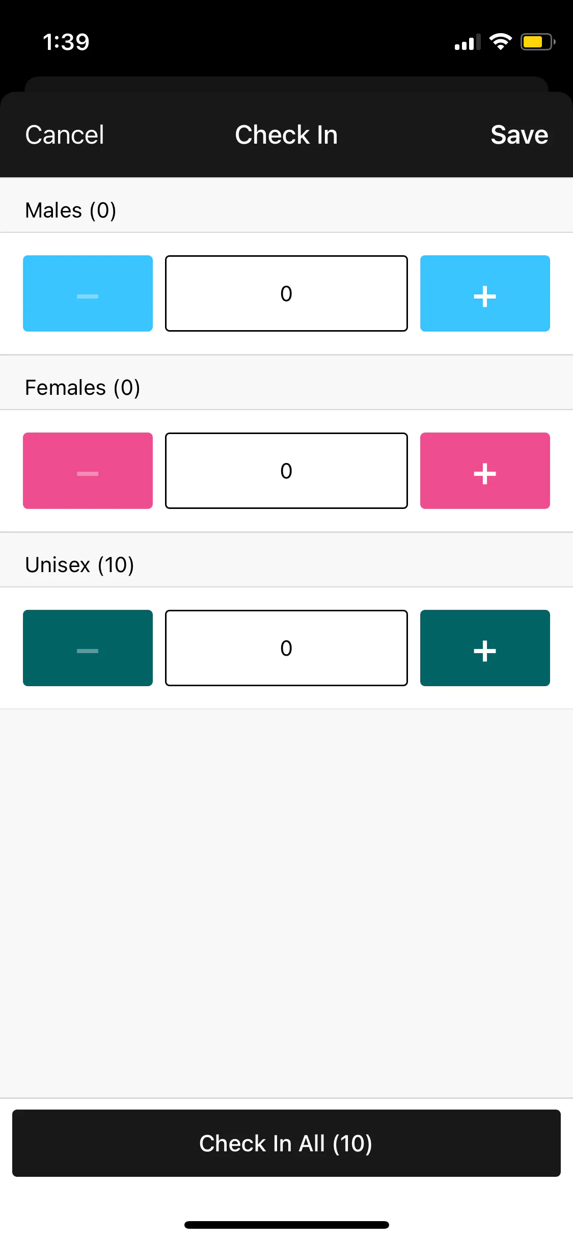 Select the number of guests (female vs. male vs. unisex) to check in, then press Save. You don't have to check in the whole party at once -- if some arrive later, you can check them in then.