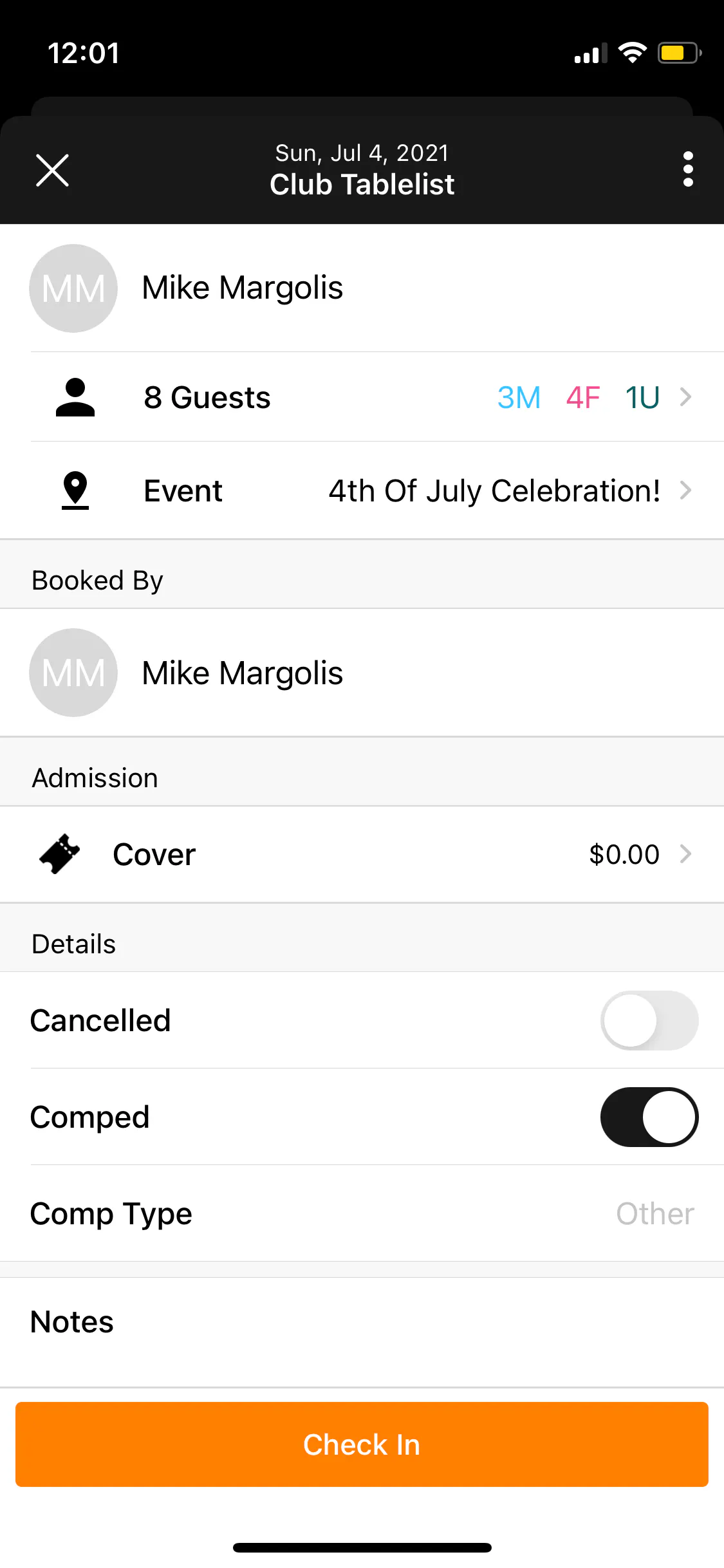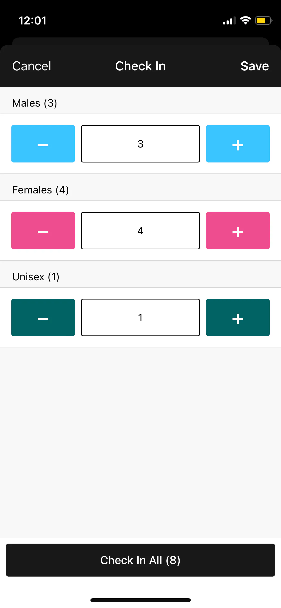 Select the number of guests (female vs. male vs. unisex) to check in, then press Save. You don't have to check in the whole party at once -- if some arrive later, you can check them in then.