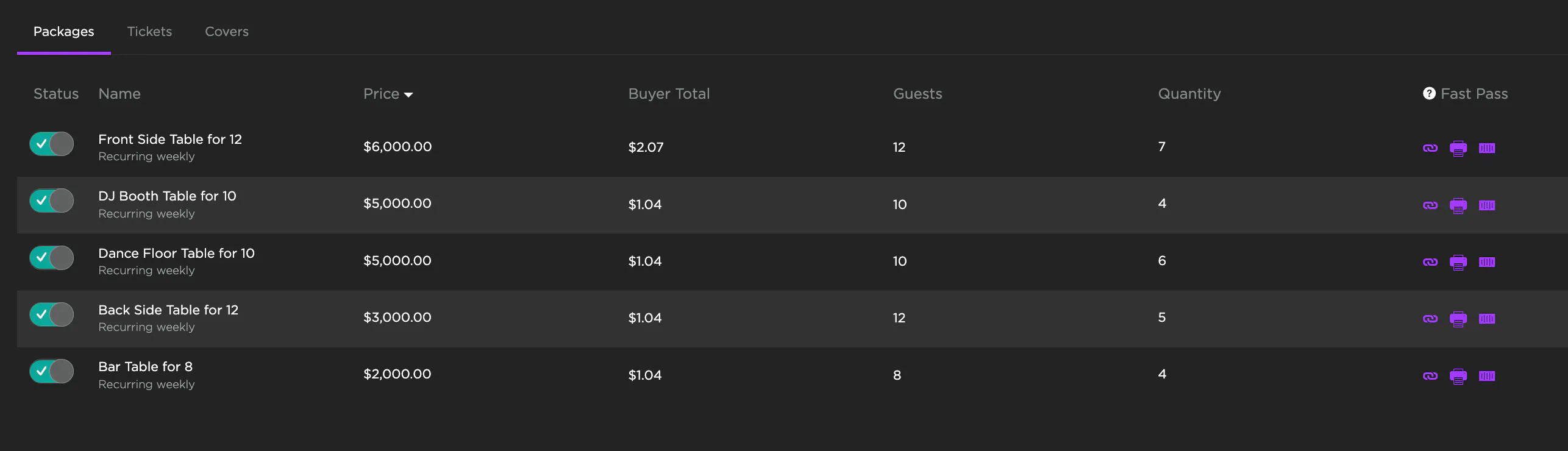 On the web, select the date at the top, go to the Inventory tab, then click Packages, Tickets, or Covers (depending on what you need). Look for the Fast Pass column on the right.