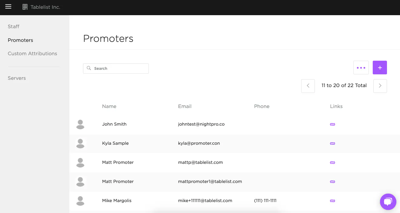 To add a promoter, open the sidebar, click Organization, click Promoters, then click the purple plus sign on the right.