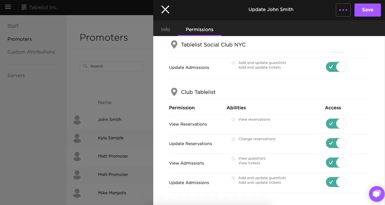 Control what your promoters can see and do in TablelistPro with permissions. To set permissions, open the sidebar, click Organization, then click the promoter's profile. Under Permissions, toggle the buttons to grant or restrict access.