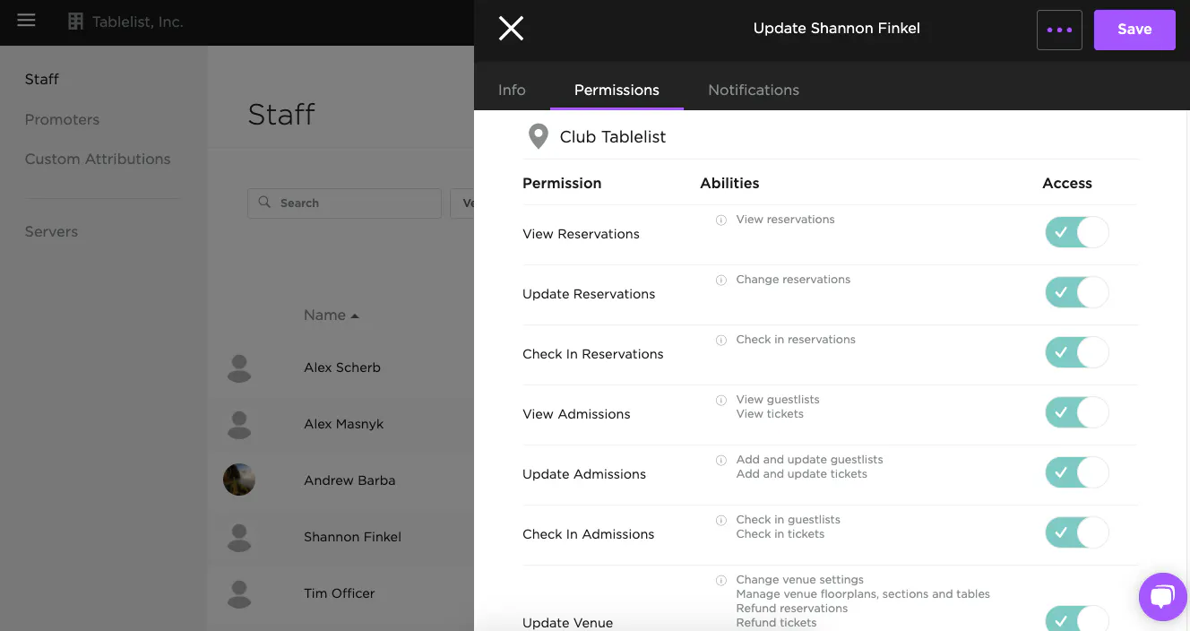 Control what your staff members can see and do in TablelistPro with permissions.
