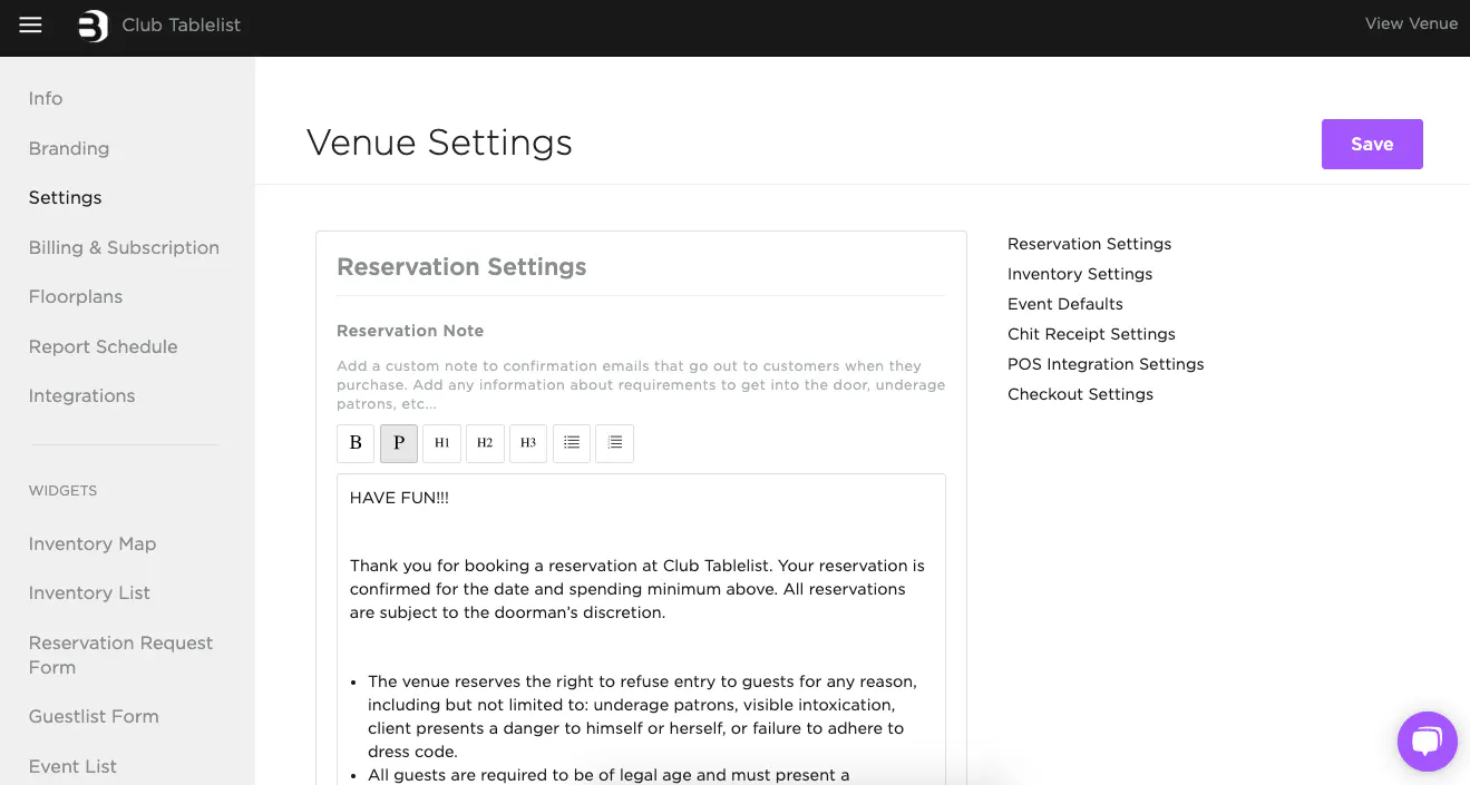Configure your venue's reservations, inventory, events, chit receipts, POS integration, and checkout by opening the sidebar, clicking Venue, then clicking Settings.