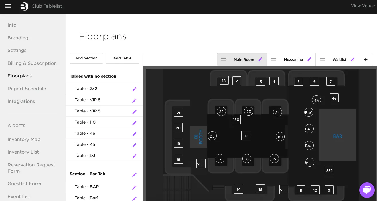 To upload, view, or edit your floor plan, open the sidebar, click Venue, then click Floorplans.