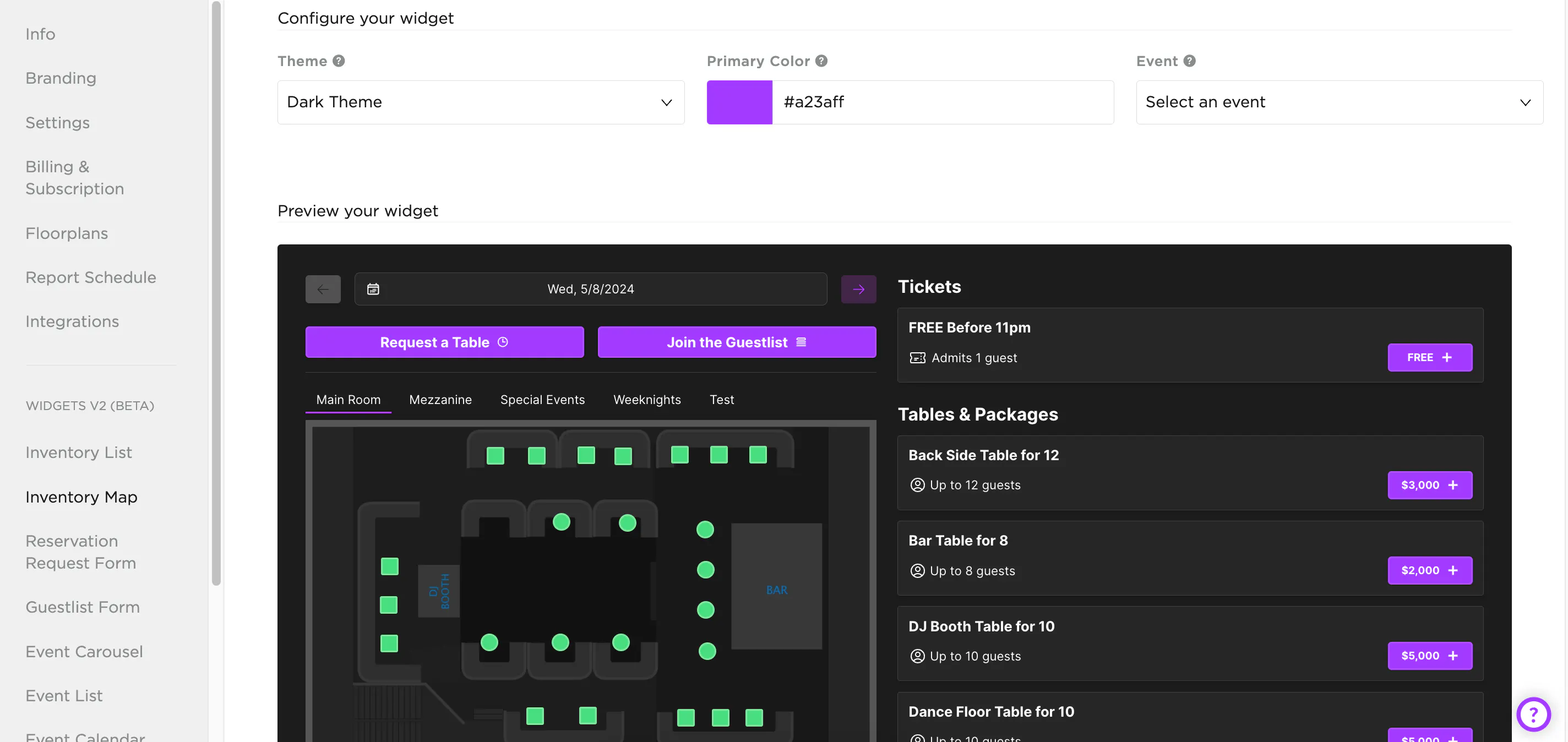 Pick your theme (light or dark) and primary color (for buttons and links), and you'll see a live preview. You can also tailor the widget to a specific event or date.