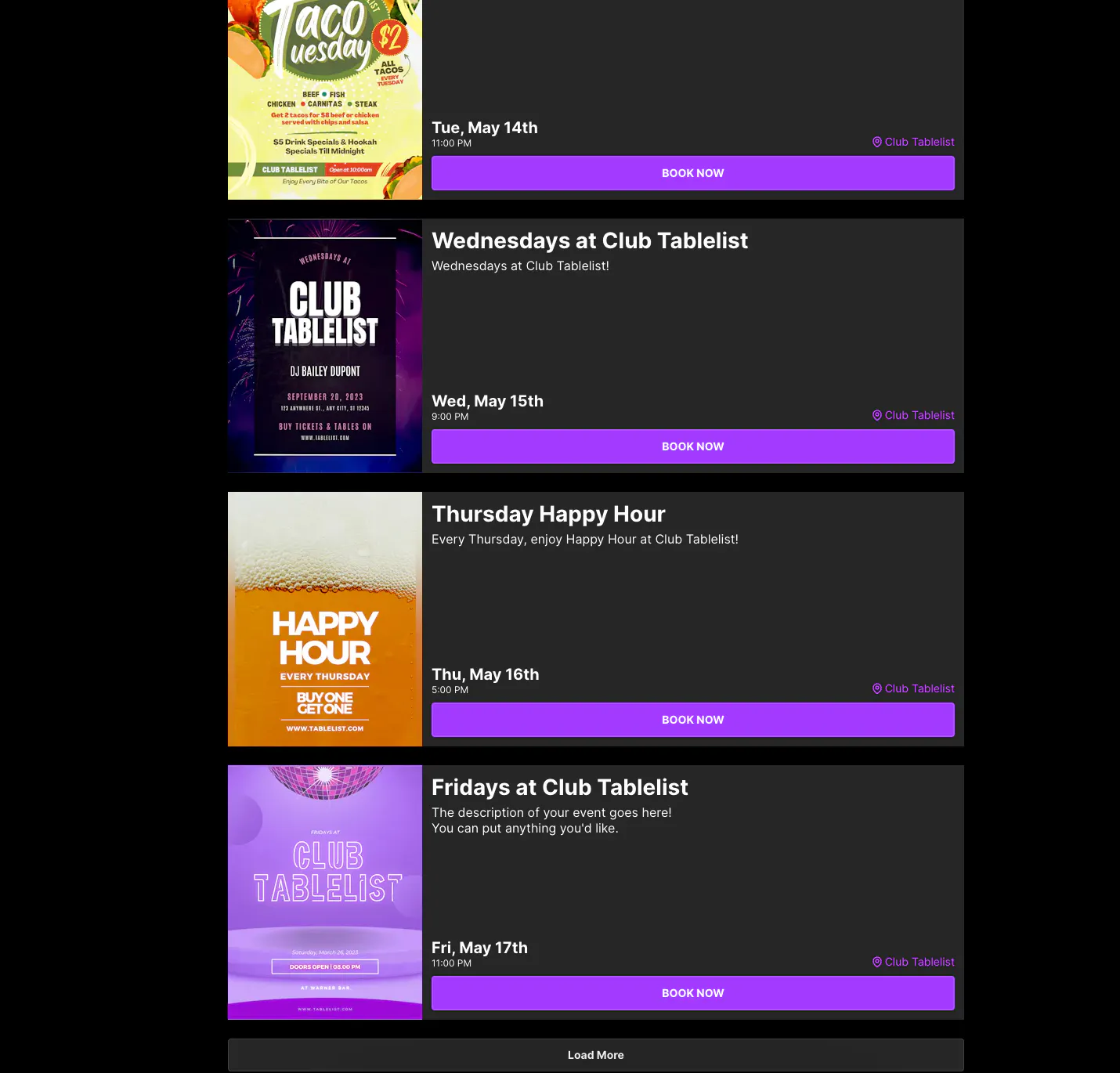 The Event List displays your events on your website so guests can buy tickets, book tables, or join guest lists -- all without leaving your site. The entire checkout stays on your domain for a fast, frictionless experience.