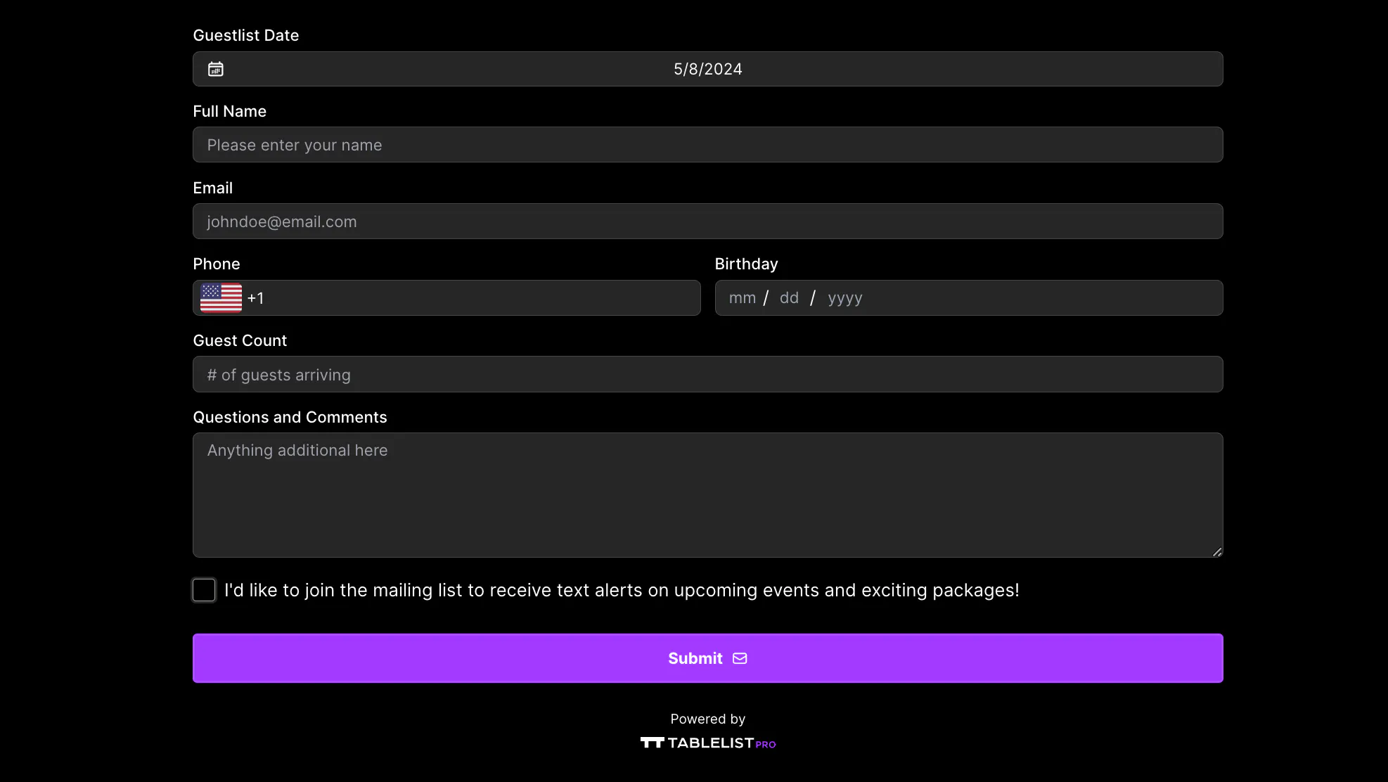 The Guest List Form lets visitors add themselves to your guest list directly from your website.