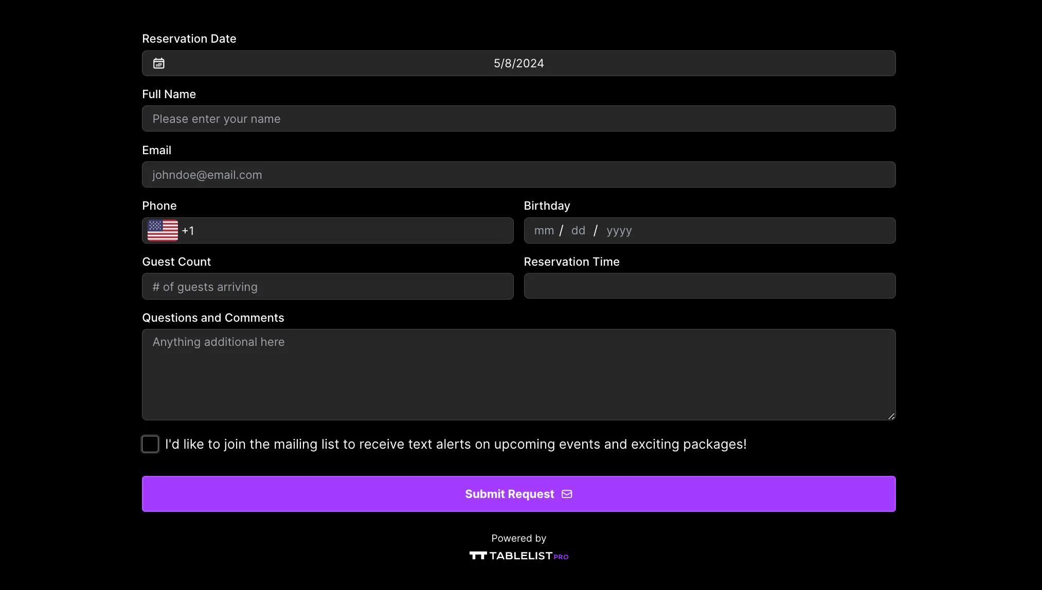The Reservation Request Form collects reservation inquiries directly from your website. Customers share their info and group details, and once submitted, you'll get notified so you can follow up and confirm.